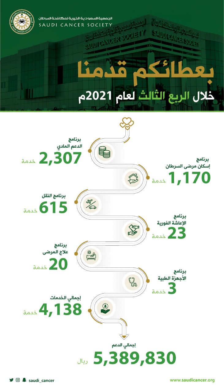 أصدرت الجمعية السعودية الخيرية لمكافحة السرطان تقريرها للربع الثالث خلال عام 2021م حيث بلغ الدعم المقدم لمستفيديها 5.389.830 ريال، عبر 4.138 خدمة.