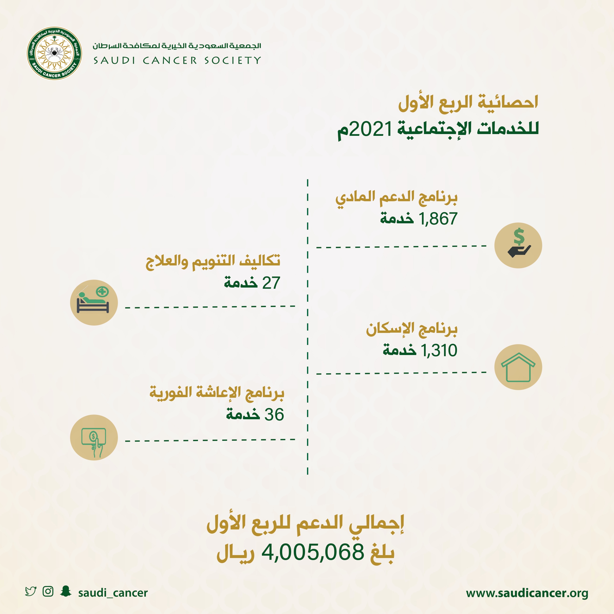 أعلنت الجمعية السعودية الخيرية لمكافحة السرطان عن تقديمها 3.240 خدمة خلال الربع الأول من العام الجاري بمبلغ تجاوز 4.000.000 ريال.