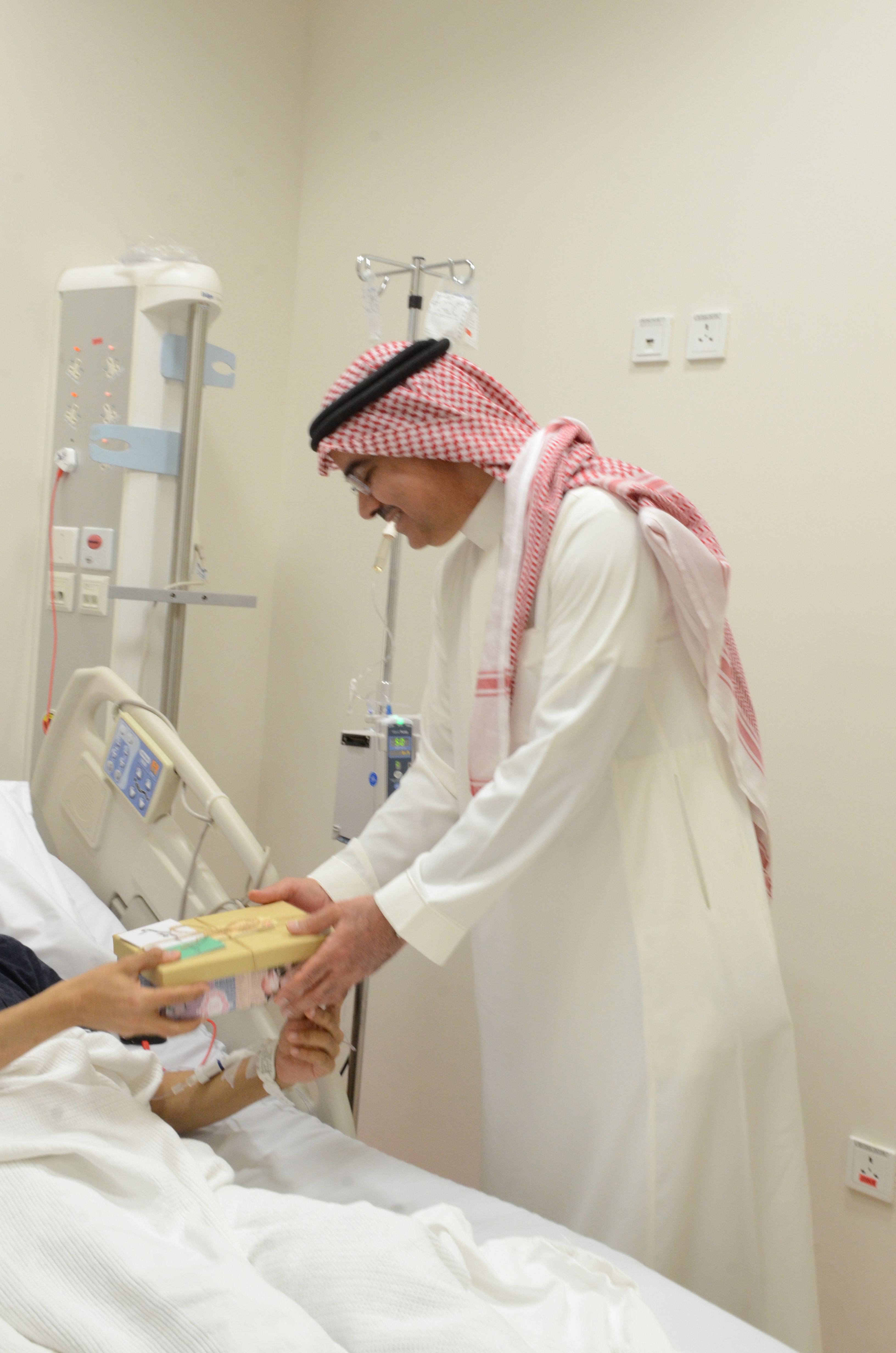 حيث قام "أ. العيد" بتهنئة المرضى بالشهر الفضيل، وتقديم مجموعة من الهدايا لهم لرفع معنوياتهم ودعمهم نفسيا، وأعرب عن شكره وتقديريه على ترتيب هذه الزيارة والتي التقى من خلالها لأحبابنا مرضى السرطان، وأوضح بأنه لمس من المرضى الهمم العالية، واتكالهم بالله تعالى وأيمانهم به.
