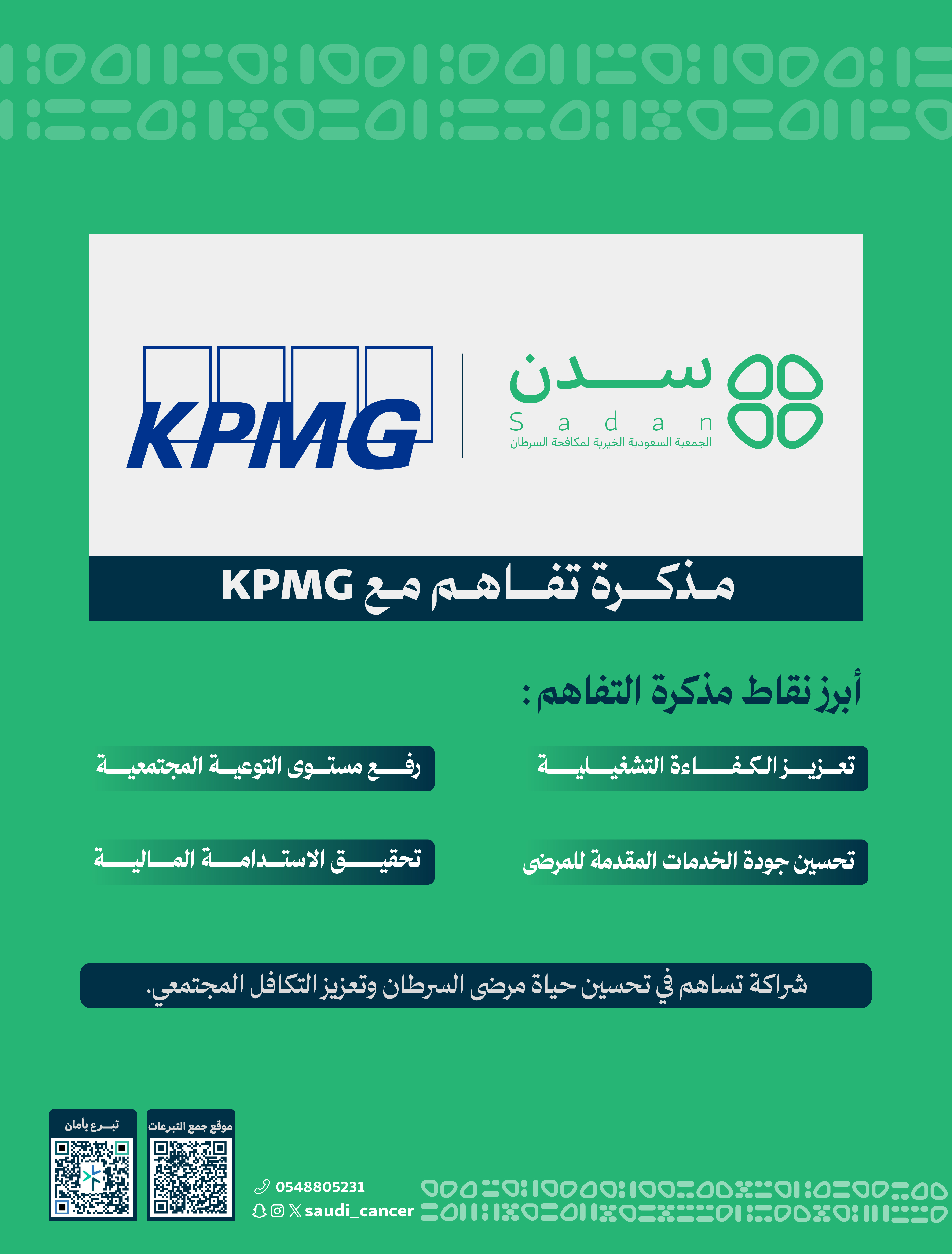 في إطار تعزيز الاستدامة والمسؤولية الاجتماعية، وقعت الجمعية مذكرة تفاهم مع شركة KPMG، إحدى الشركات البارزة في مجال الاستشارات والخدمات المهنية، تهدف هذه الاتفاقية إلى تعزيز جهود الجمعية في مكافحة السرطان، من خلال تقديم استشارات استراتيجية ومهنية تساعد في رفع كفاءة مبادراتها التوعوية وتوسيع نطاق خدماتها.