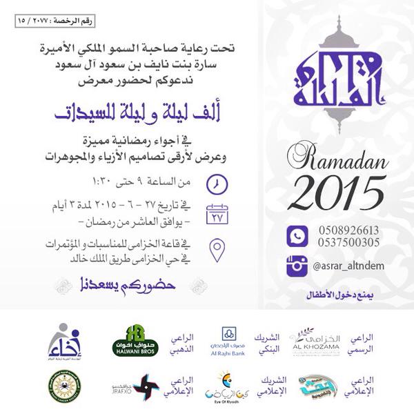 تشارك الجمعية اليوم كراعي إعلامي بمعرض ألف ليلة وليلة تحت رعاية الأميرة: ساره بنت نايف ال سعود وذلك لمدة ثلاث ايام.