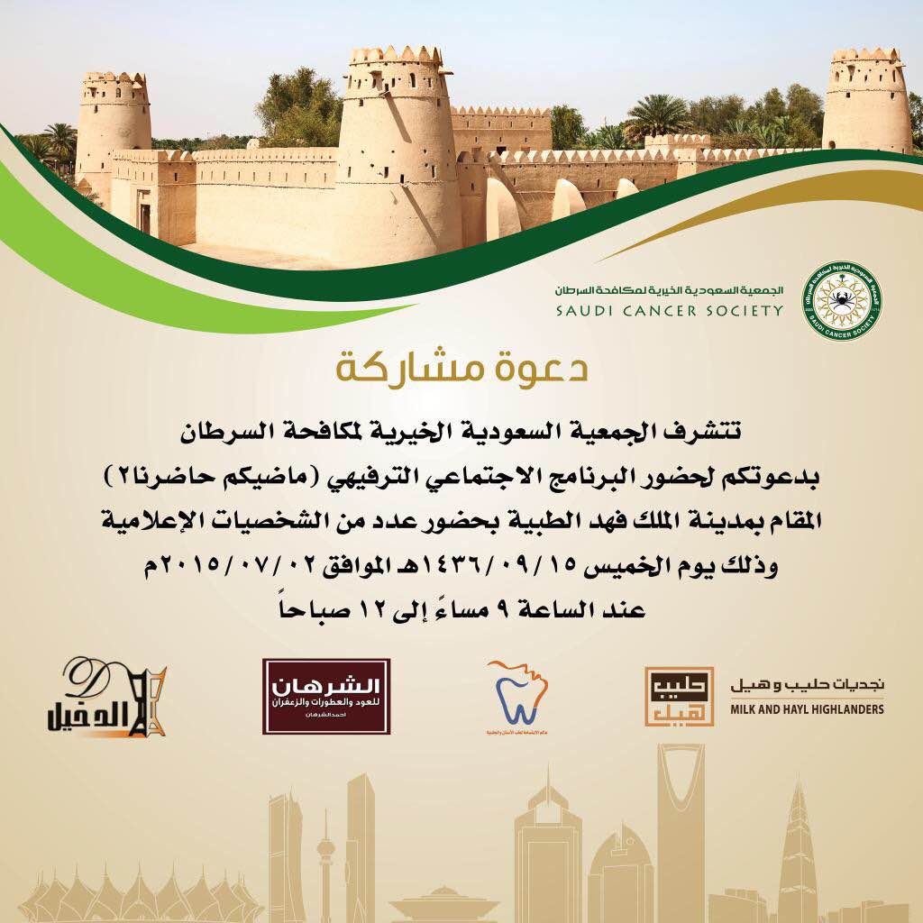 تنظم الجمعية السعودية الخيرية لمكافحة السرطان برنامجها السنوي ( ماضيكم حاضرنا 2 ) المقام في مدينة الملك فهد الطبية وذلك يوم : الخميس 15/9/1436 من الساعة 9 مساءا وحتى 12 صباحا.